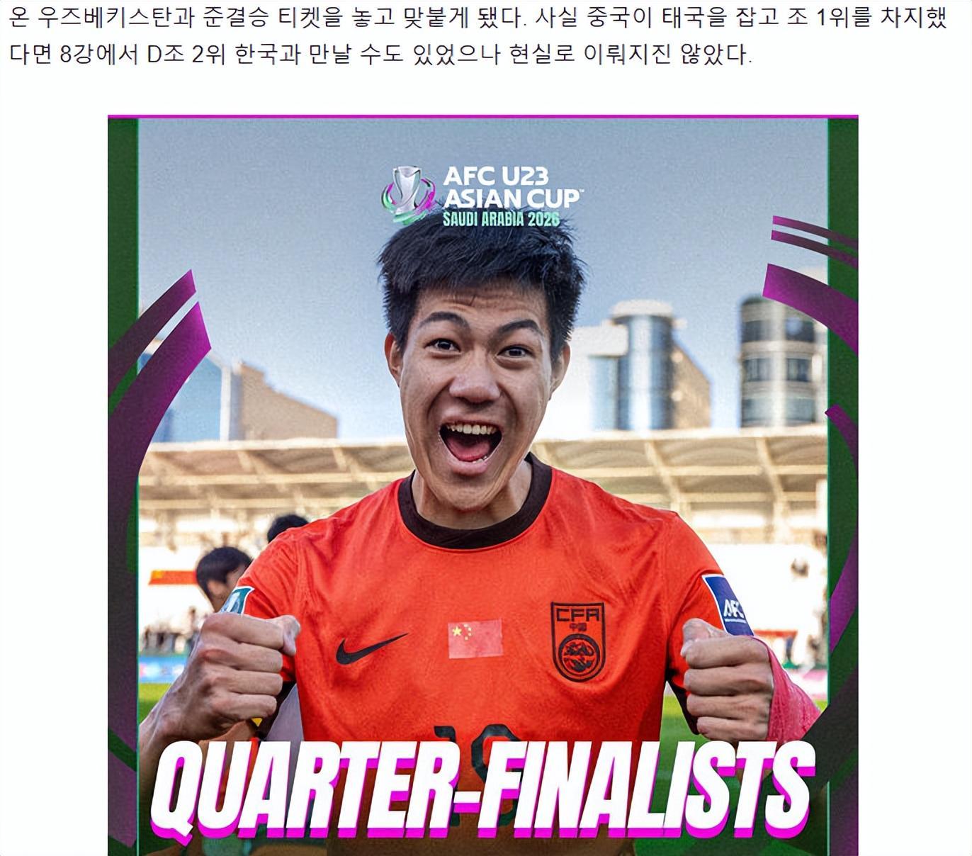 因此,《OSEN》表示,韩国足球务必要知耻而后勇:“为了避免更大的耻辱,韩国队必须在四分之一决赛中展现出不同的一面。击败澳大利亚,争夺2026年亚足联U23锦标赛的冠军。”