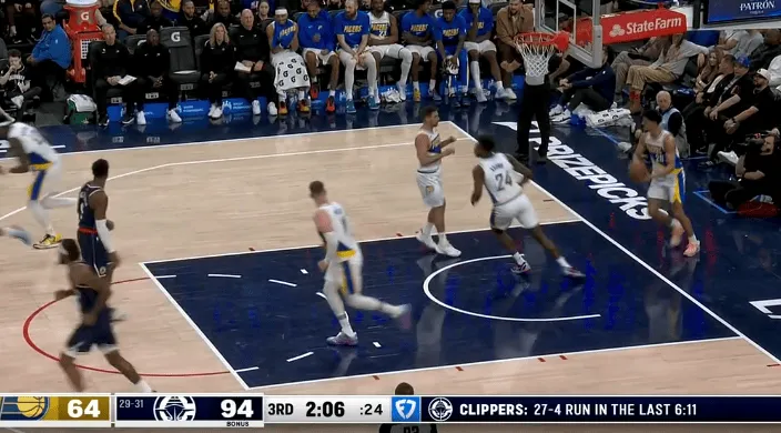 第三节比赛中,马瑟林单挑科比-布朗打成2+1,快船轰出27-4领先步行者30分。